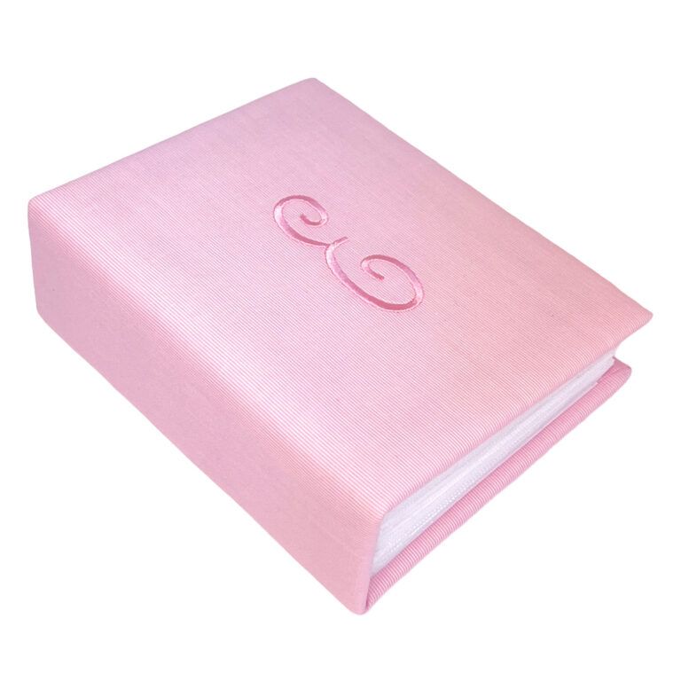 Safeguard your precious memories with this Small Hardbound Photo Album crafted from micro-striped cotton, offering a subtle yet stylish texture. Available in pink or blue, this fabric-wrapped photo album measures 5" x 6.5" and contains 50 PVC-free, acid-free pocket pages, providing space to hold 100 photos up to 4" x 6". Personalize it with a name, monogram or initial.