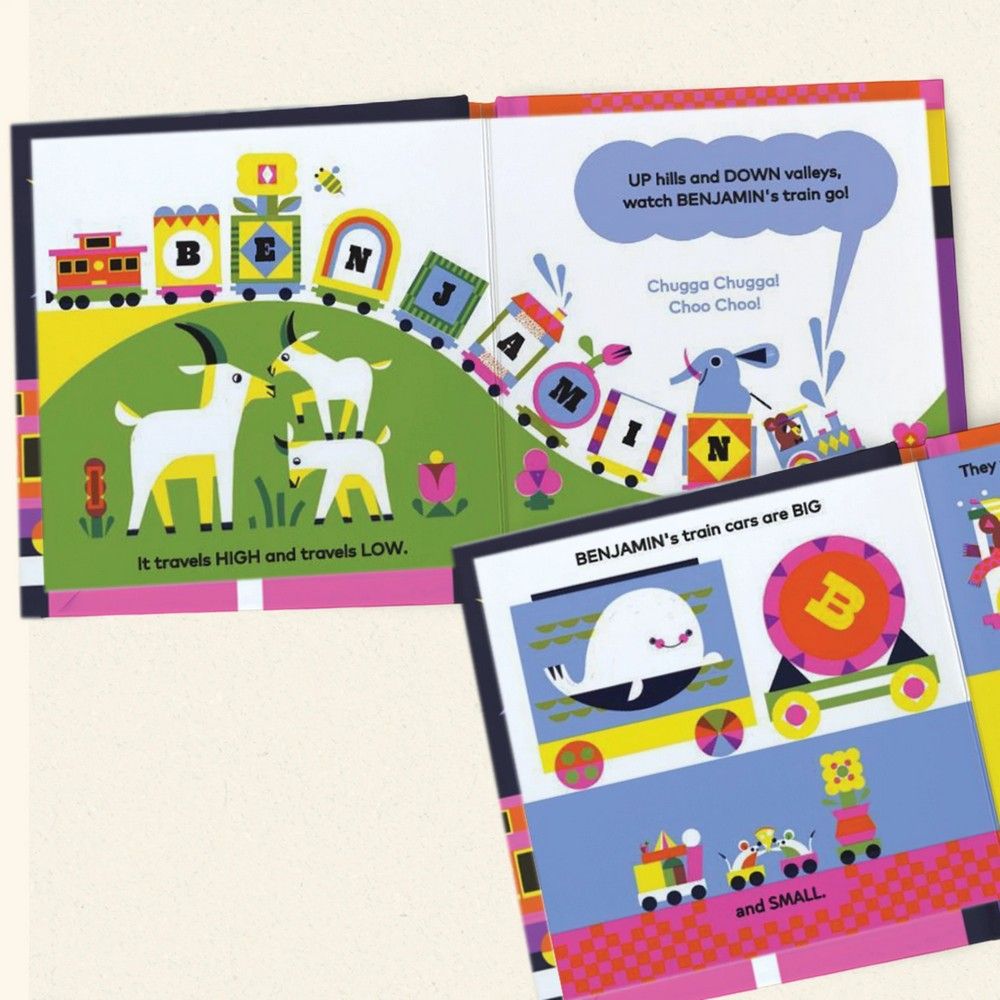 All aboard the name train! This personalized board book teaches your child about opposites as their name is pulled by a colorful train. See your little one’s face light up as they find their name in the story and illustrations! Explore the concept of opposites in a fun and engaging way, as the name train departs the child’s town and travels up and down, through the night and day, in hot and cold. Delight your little one with a children’s book that’s as special as they are! With whimsical illustrations and a fun rhyming story, this keepsake makes storytime magical for babies and toddlers alike.